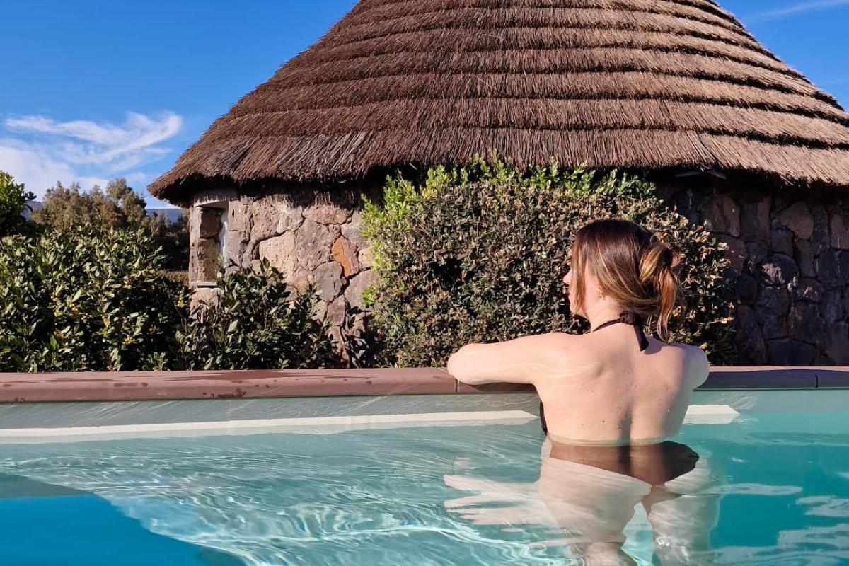 Soggiornare nelle pinnettas rivestite di pietre in basalto, sotto una volta di legno e un tetto di frasche e dotate di tutti i comfort è una esperienza di autentico relax.